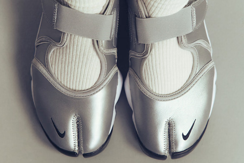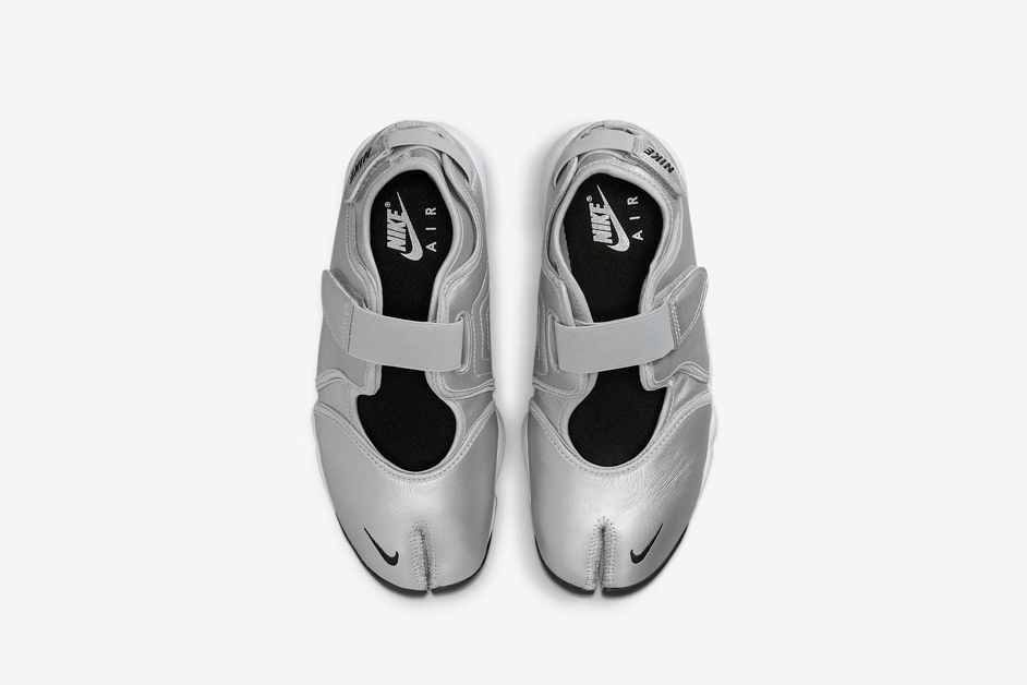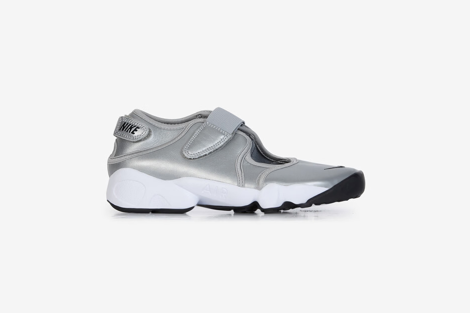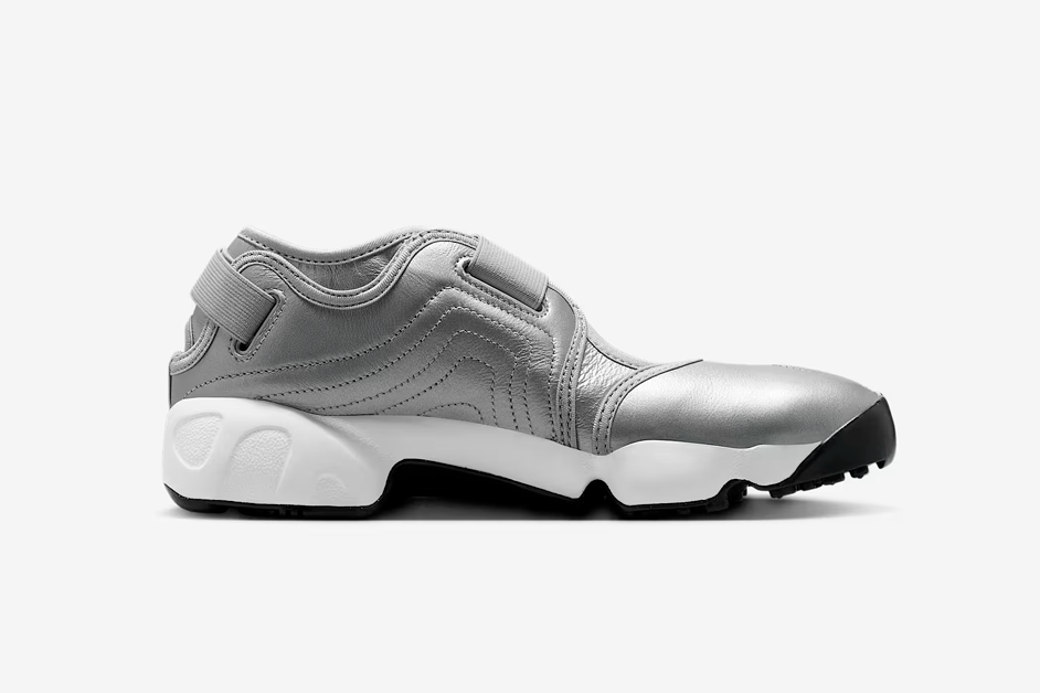 La Nike Air Rift en version argent (ou « Metallic Silver ») est une réinterprétation moderne d’un modèle emblématique des années 1990. Elle se distingue par son design audacieux et sa silhouette hybride entre sneaker et sandale. La Air Rift argentée présente une tige en cuir pleine fleur métallisé, associée à des accents noirs et blancs. Son design split-toe, inspiré des sandales traditionnelles japonaises, offre une sensation de liberté tout en maintenant une stabilité optimale. Au prix de 130€ chez Courir.