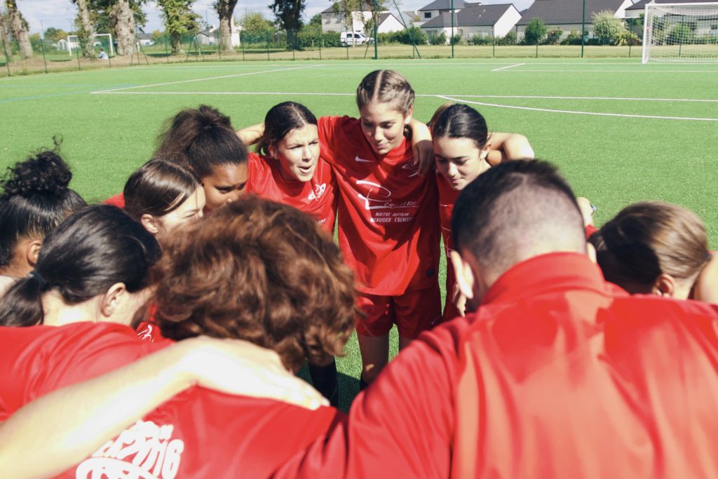 « Benzema, Kimpembe, Mbappé, Eugénie Le Sommer, Amandine Henry… », les noms fusent quand on demande aux U15 de nous donner leurs exemples dans le ballon rond. Tous sont français. Et dans cette ville moyenne de province, le match de gala joué par l’équipe de France féminine en 2019 au stade Francis Le Basser, fief du Stade Lavallois, a largement participé à la cohésion du groupe. Adrien le reconnait : « Je cite souvent des références de garçons, par habitude, mais les filles connaissent leur sujet et ça va venir avec le temps ». Ce qui vient aussi, c’est la place gagnée par les filles pour s’imposer dans ce club qui compte quasiment une dizaine d’équipes masculines. « Moi j’ai demandé à ce que ce match soit joué sur le synthétique. C’est simple, les filles doivent avoir le même traitement que les garçons sinon j’me barre », nous lance le coach. Épaulé par le directeur de l’AS Bourny, il repart ce samedi avec une première victoire. 11 à 0. Sans vraie gardienne. Dans les vestiaires on lance un dernier cri de guerre. « Oh non tu ne vas pas encore nous mettre ton vieux Naps là ». Trop tard, les portables ont été récupérés, ils sont posés sur la table pour une dernière chorégraphie qui finira sur Insta et Snap. « C’est la kiffance, c’est la kiffance ».