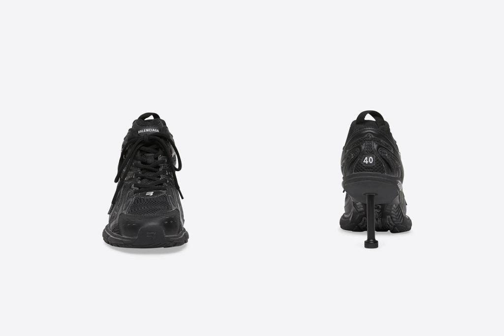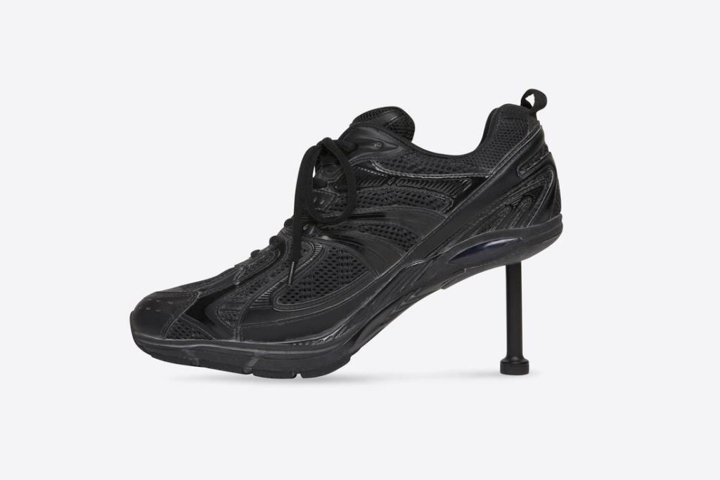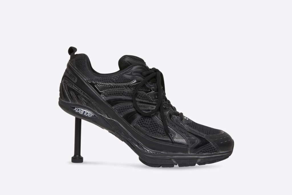 Le vestiaire de Balenciaga s’inspire désormais des meilleurs memes trouvés sur le net. Après une paire de Crocs à talons dévoilées en juin dernier, la marque emmenée par Demna, reprend la même tige « aiguille » et vient la coller à sa sneaker Xpander. Le résultat : une sneaker à talon qui semble encore une fois sortie tout droit des meilleurs détournements sur internet. Prix de la parodie : 995 euros tout de même. Vendue et noir et en blanc, la chaussure Balenciaga mise sur un upper en maille et nylon avec un talon de 8 cm.