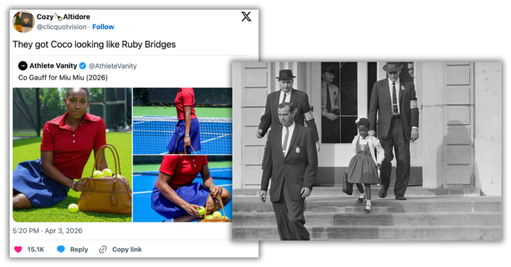 Une vidéo qui a un contexte : les (nombreuses) critiques reçues sous la publication Instagram de la campagne qui pointe, notamment, « son manque d’effort » capillaire. Et ne parlons même pas des utilisateurs de X (ex-Twitter), qui ont passé le week-end à scruter la chevelure de Coco Gauff, regrettant qu’elle n’ait pas plaqué ses cheveux, comme le voudraient les conventions. On a pu lire qu’elle était « négligée », que c’était « gênant » de la voir ainsi. D’autres sont même allés jusqu’à la comparer à Ruby Bridges, la petite fille escortée dans une école primaire de La Nouvelle-Orléans par des agents fédéraux en 1960, sous les manifestations de parents blancs mécontents. Un rapprochement des plus dérangeants, notamment vis à vis de son décalage avec le monde du luxe qu’incarne Coco Gauff dans cette campagne.