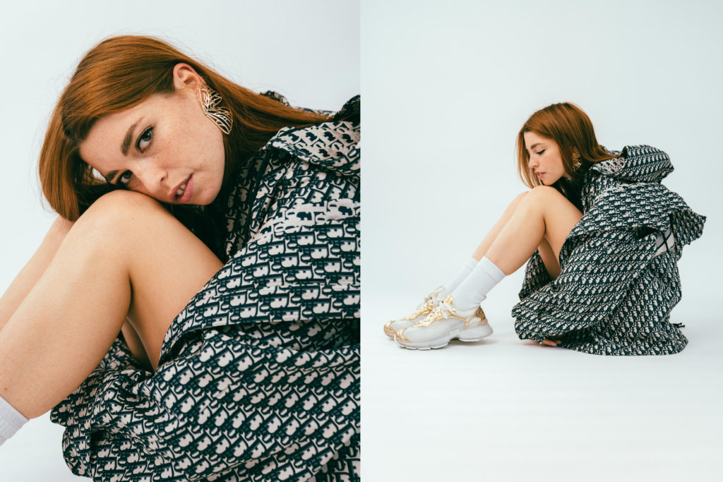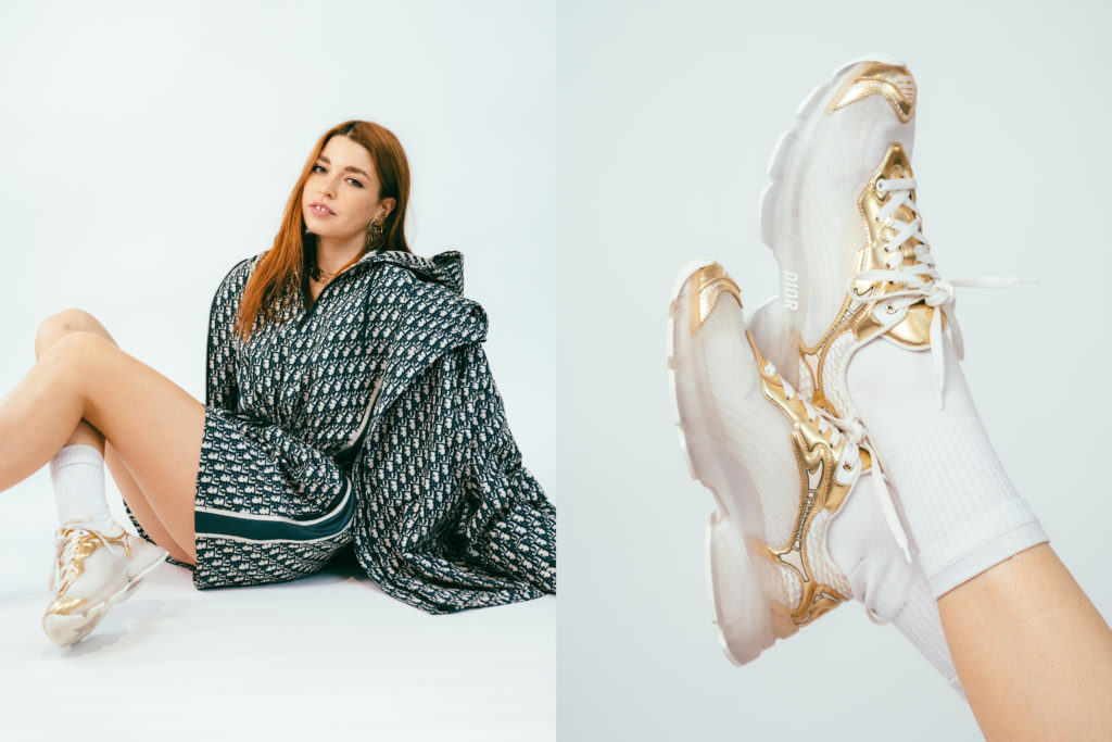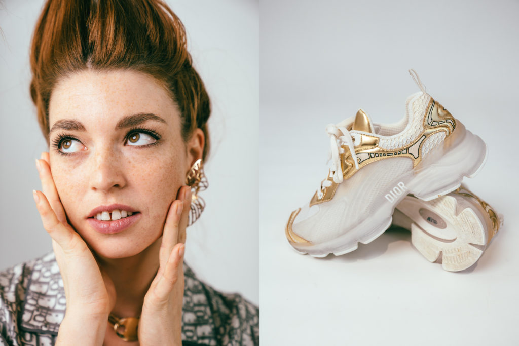 Le nom de Dior est lui apposé sur les flancs extérieurs de la sneaker, le tout dans une nuance de blanc qui vient donner encore un peu plus de légèreté à la silhouette de la Dior Vibe. Côté matières, la maison de luxe mise sur une résille blanche tout autour de la chaussure, d’un cuir doré distillé sur plusieurs empiècements à l’avant et à l’arrière et d’une gomme transparente pour encore plus de malléabilité. Sur le talon, une étoile, figure chère au couturier Christian Dior, se glisse comme un clin d’oeil au père de la griffe. Disponible en gris et en or, la Dior Vibe affiche un prix de 950€ et est disponible dès maintenant sur l’eshop de la maison.
