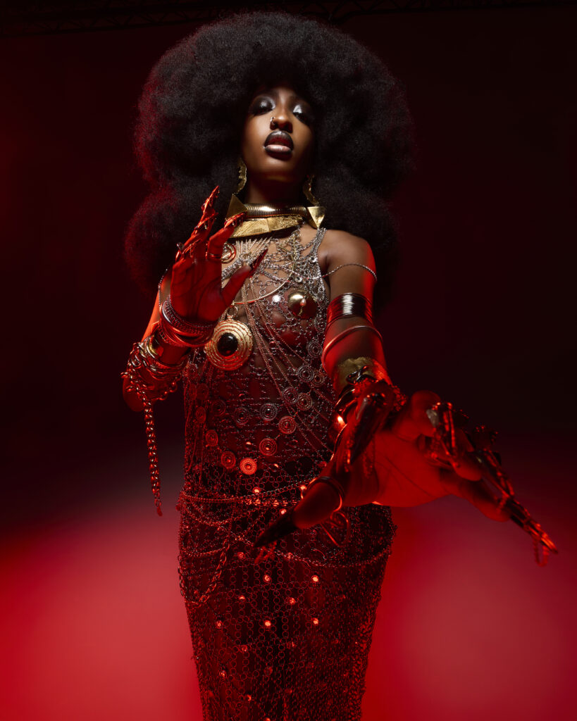 Le robot, c’est celle qui cherche son humanité. qui a envie de se défaire de ses codes, qui a envie justement de sortir de ce côté robotisé et de retrouver cette simplicité. Queen Sheba, c’est une énergie, un idéal vers lequel je tends. Je ne suis pas encore Queen Sheba. C’est comme comme un espèce d’objectif qui est là, devant toi, qui te pousse à aller de l’avant, qui te pousse à te développer. Cette femme puissante, qui n’a peur de rien, qui ne se laisse pas faire, qui a confiance en elle. C’est un peu elle qui est au contrôle de toute mon histoire, qui est au contrôle de mon destin. C’est un peu ésotérique, mais c’est comme ça que je le vois.