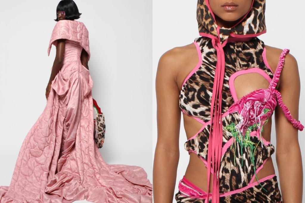 Si elle travaille actuellement chez Courrèges, Marie Pasquiet élabore en parallèle sa propre marque. Cette diplômée de l’IFM s’inspire d’une recette explosive. Elle saupoudre ses créations de poussières de bling-bling, de kitsch et de mauvais goût. Mélangez tout ça et vous aurez quoi ? Bibbidi-Bobbidi-Boo : une marque du nom de Marie Taylor qui semble sortir tout droit de l’esprit de Paris Hilton. Robe ajourée léopard surmontée de coutures roses flashy, des boucles d’oreilles en perles reprenant les logos des grandes marques et semblant sortir tout droit des métiers à tisser que vous aviez enfant… Rien ne sembler échapper à l’aiguille magique de Marie Pasquiet, jeune créatrice de 22 ans qui s’inspire également d’objets du quotidien comme de cette couette rose transformée en robe du soir.