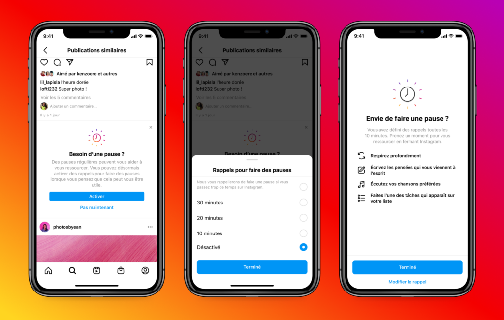 « Take A Break est conçue pour donner aux utilisateurs les moyens de prendre des décisions plus éclairées sur la façon dont ils passent leur temps sur Instagram », écrit le réseau social dans un communiqué et qui détaille sa nouvelle fonctionnalité ainsi :