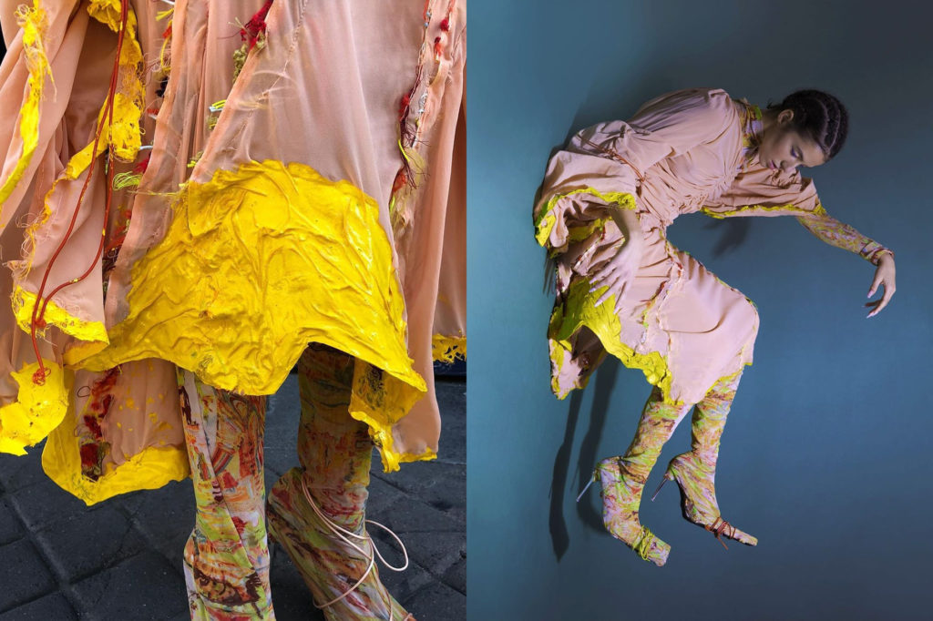 Je dirais que les produits phares de ma marque sont mes robes techniques en nylon fin gonflantes, que je ressers avec des élastiques pour créer des formes organiques étranges légères; mais également mes pièces que je travaille en peinture de latex pour imiter des peaux et remplacer le cuir.