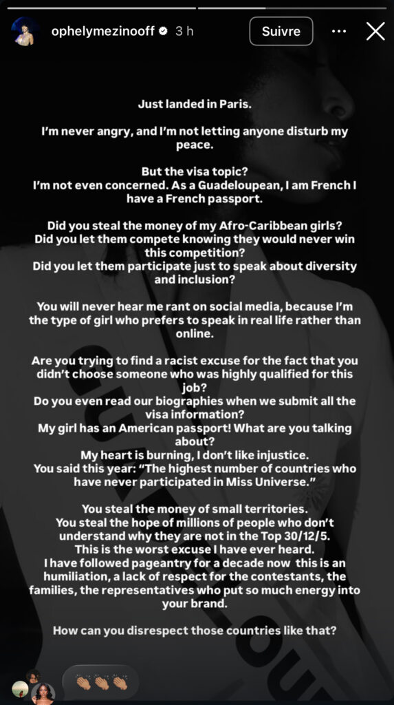 Depuis le partage de cette vidéo, Miss Guadeloupe, Ophély Mézino, grande favorite aux côtés de Miss Côte d’Ivoire a réagi dans une story Instagram : « Avez-vous volé l’argent de mes filles afro-caribéennes ? Les avez-vous laissées concourir en sachant qu’elles ne gagneraient jamais cette compétition ? Les avez-vous laissées participer juste pour parler de diversité et d’inclusion ? ».