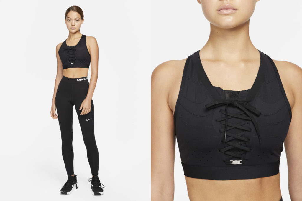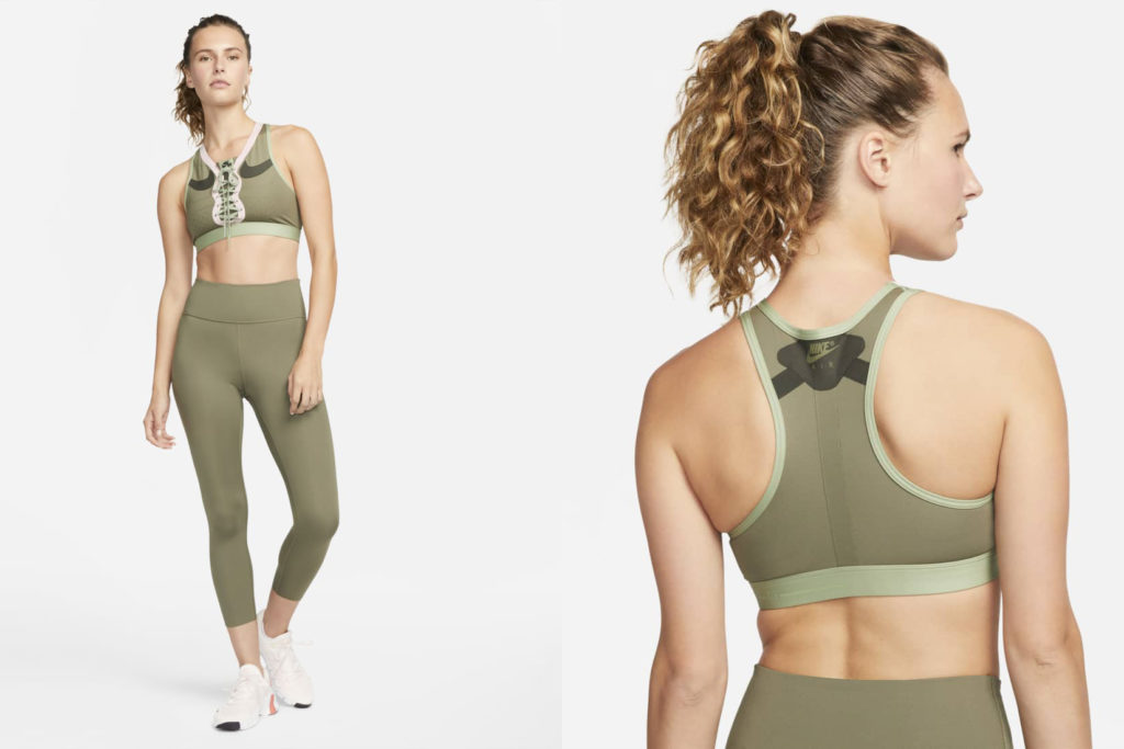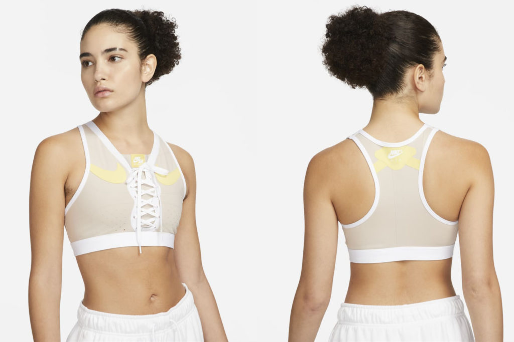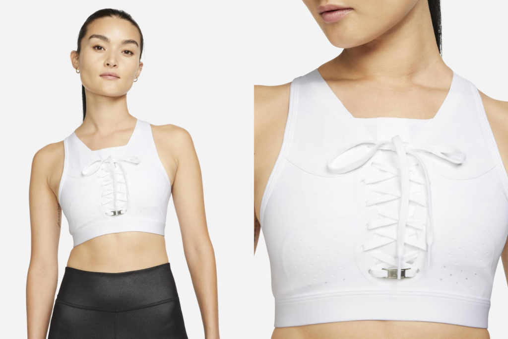 Les petits créateurs d’upcyling auront surement donné des idées à Nike qui vient de transformer sa Air Force 1 en une brassière de sport. La chaussure iconique du swoosh est en effet la dernière muse de Nike qui s’est inspiré de la silhouette de sa sneaker intemporelle pour injecter des éléments phares de sa chaussure sur un top dédié à la pratique sportive. Ce dernier se pare de deux lacets à l’avant offrant ainsi un effet lacé sur la poitrine. Le petit empiècement métallique que l’on retrouve d’habitude sur le devant de la chaussure est lui aussi rapporté sur la brassière de sport.
