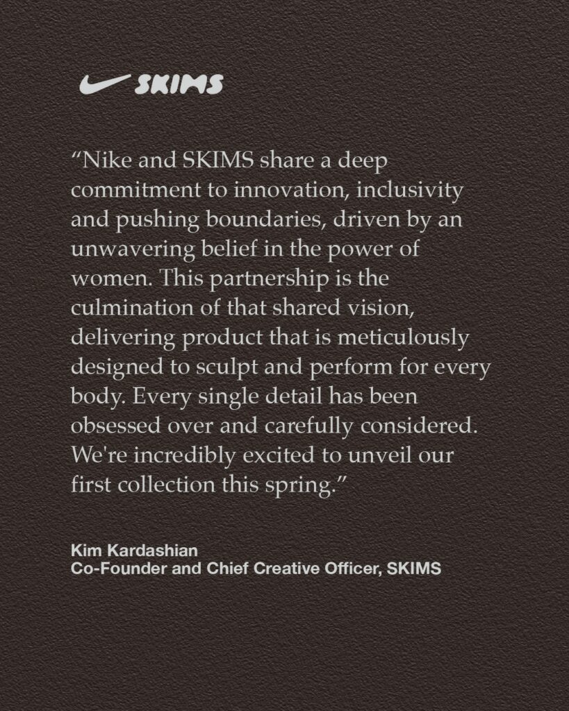 C’est un mariage pas si inattendu, puisque SKIMS s’était déjà essayé au sport en devenant le fournisseur officiel des athlètes américains lors des JO de Tokyo. Pas si inattendu encore, si on se rappelle qu’en 2022 SKIMS avait embauché une ancienne de chez Nike dans ses équipes. Voilà donc qui fait sens pour Nike, leader mondial dans le monde du sport de se rapprocher de SKIMS, marque de shapewear fondée par Kim Kardashian.