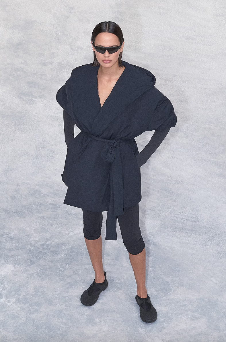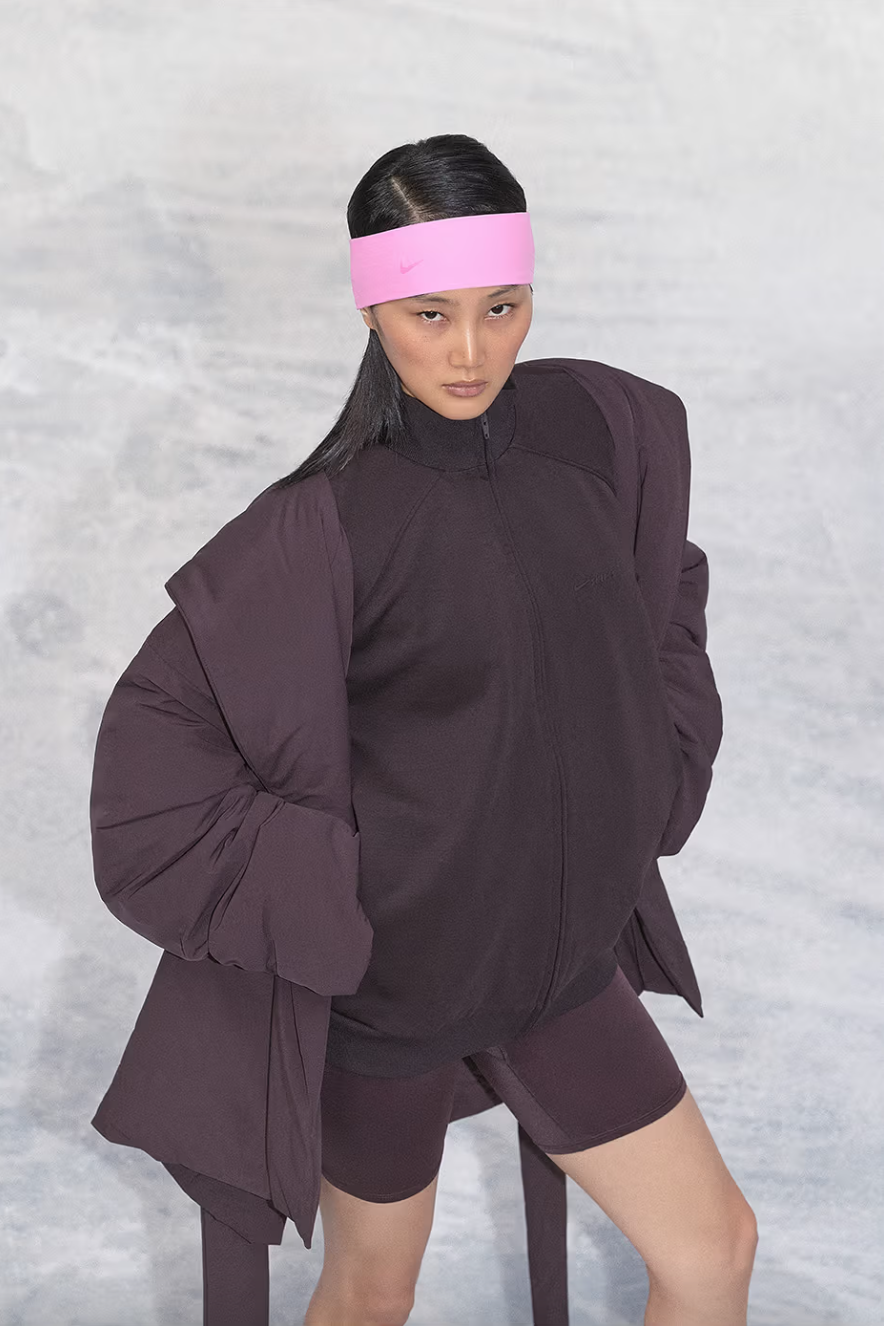C’est d’ailleurs ce que porte comme message la pièce phare de ce nouveau drop, le Wrap Coat en nylon tissé (une première pour la marque), parfaitement adapté au froid. Une veste déjà phare qui inaugure la nouvelle catégorie matière de la marque Woven Nylon, qui vient s’ajouter aux six autres : Shine, aux coloris audacieux ; Matte, qui sculpte et lisse grâce notamment à la technologie Nike Dri‑FIT ; Airy, qui laisse le corps respirer ; Weightless Layers, qui mise sur des superpositions légères ; Matte Tricots, inspirée des avants et après entrainement d’athlétisme et Vintage Seamless, parfaite pour les séances en studio.