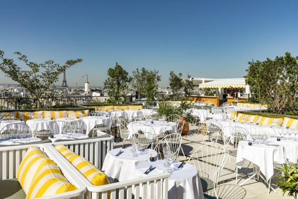 Niché au dernier étage du Printemps Haussman et offrant une vue imprenable sur la Tour Eiffel, Perruche incarne le rooftop parisien par excellence. Le lieu propose une décoration élégante et estivale à travers une végétation abondante et des touches de couleur avec un jaune citron que l’on retrouve sur les divans et les chaises. Côté cuisine, les plats proposés sont raffinés et délicats grâce à des ingrédients sélectionnés avec soin. La cuisine méditerranéenne est mise à l’honneur avec un poulpe à la plancha, un risotto au safran ou encore un thon mi-cuit au sésame que vous pouvez accompagner de breuvages exquis.