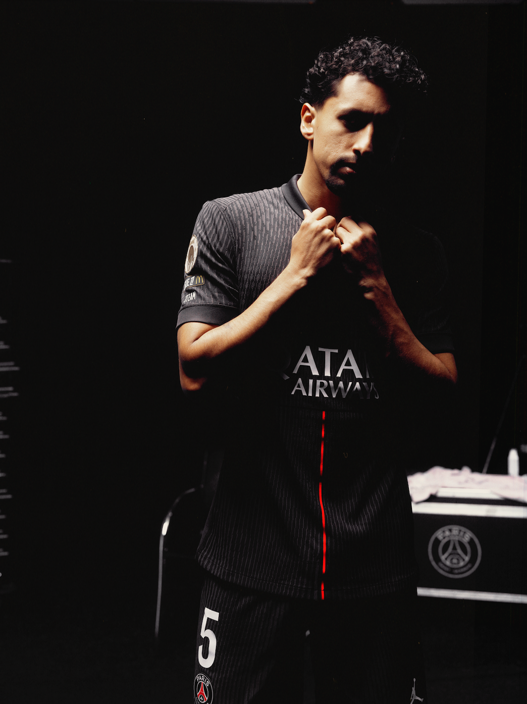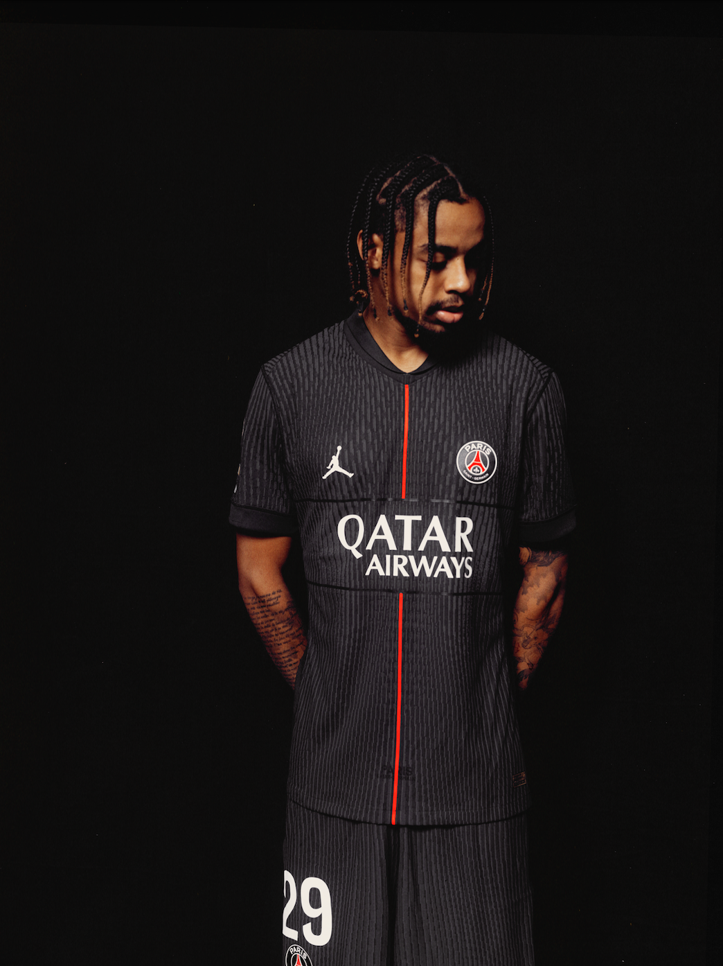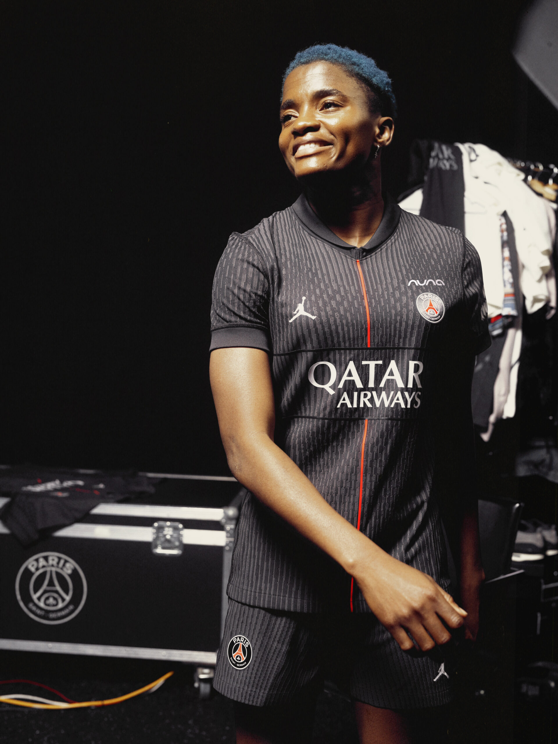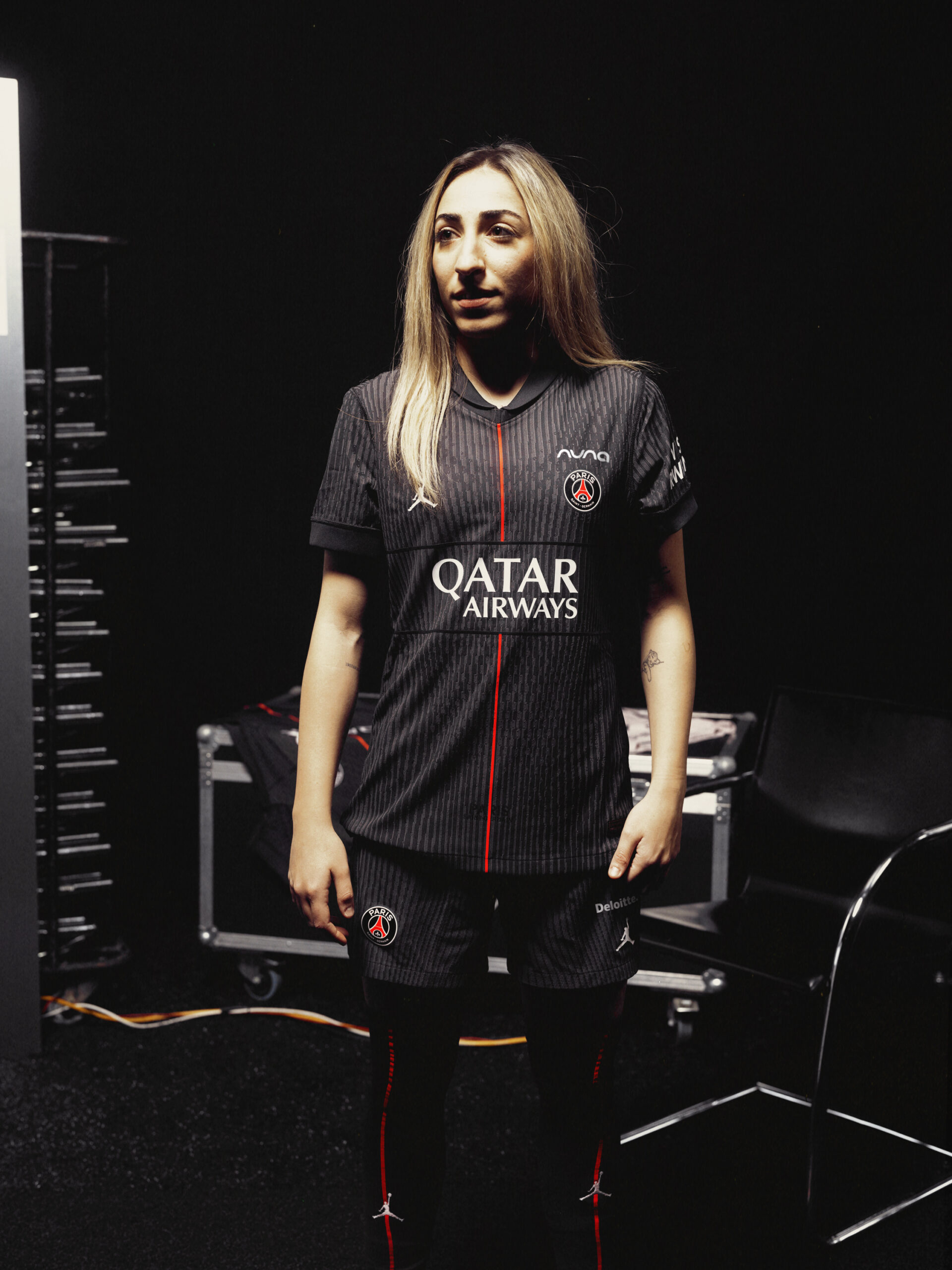 Le Paris Saint-Germain et Jordan Brand dévoilent le quatrième maillot du Club pour la saison 2025-2026, et rendent hommage à l’identité de la ville de Paris, entre grâce et performance. Décliné pour l’équipe masculine et féminine, le maillot s’inspire en effet des ateliers de couture parisiens, et fait le lien entre la précision du jeu des sportifs et celle du geste des artisans de la capitale. Noir, rythmé par des teintes de gris anthracite, des nuances de rose, et une ligne centrale rouge, le jersey mise sur le « chic à la française » et la sobriété. “Du col élégant jusqu’aux coutures apparentes, chaque détail a été pensé pour conjuguer élégance et technicité,” précise d’ailleurs un communiqué, qui nous apprend que la technique Cross-Dye a été utilisée pour la première fois afin de renforcer le caractère premium des maillots.