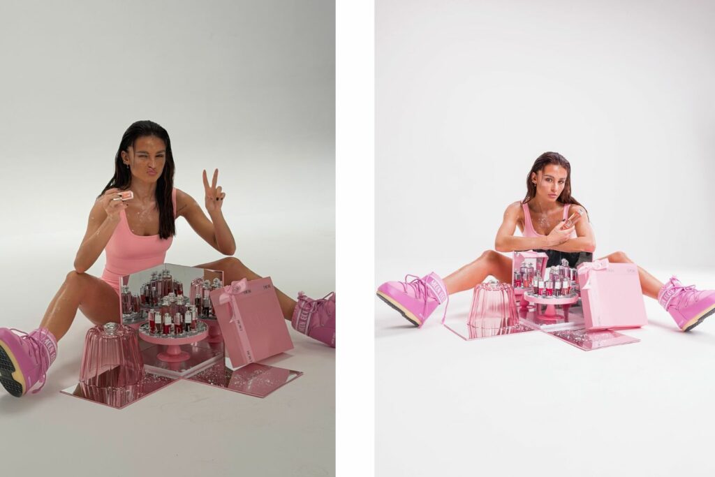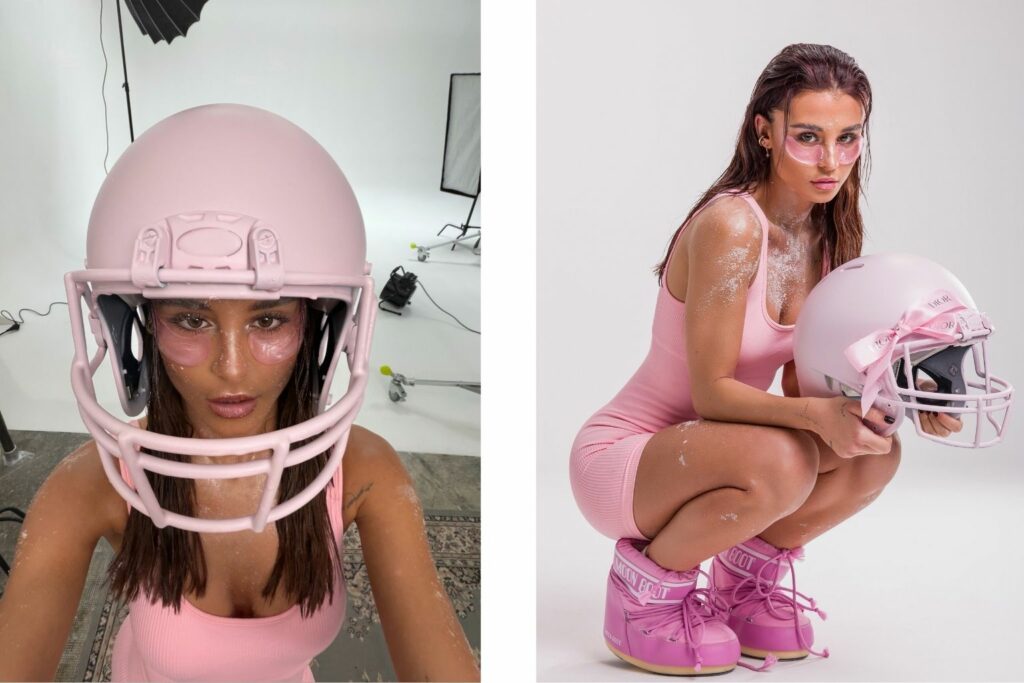 L’idée germe un lundi. Les photos, elles, sont prises un vendredi. Une temporalité courte pour un projet édito, mais si longue par rapport aux trois clics qu’il a fallu aux autres pour générer leurs portraits rose bonbon. « Je me suis dit “écoute on est lundi, vendredi tu dois faire le shooting, tu vas tout donner”. Le message que je voulais faire passer derrière ce concept c’est : “toi tu défies l’IA, tu crées du réel à partir de l’IA.” » S’en suit alors une course folle pour l’influenceuse, qui doit démarcher des professionnels pour l’accompagner dans son projet, mais aussi gérer son stylisme ou la location d’un studio. « J’ai contacté une équipe de photographes le lundi pour le vendredi, ils ont fait le maximum pour m’accompagner, ils ont été incroyables. Il y avait aussi une DA derrière nous, qui m’a aidée sur plein d’aspect, à trouver la cagoule par exemple qu’on a déniché chez Kiabi, pour 7 euros, où à réaliser cet effet neige le jour du tournage, énumère-t-elle, Pour le stylisme, je me suis débrouillée toute seule, j’ai tout trouvé en moins de 48 heures. Le casque, je l’ai trouvé sur Leboncoin, je l’ai peint en rose. Nous étions cinq sur le set : la DA, les deux photographes, mon frère – qui est coiffeur -, et moi, qui me suis maquillée toute seule. Le vendredi, le shooting a duré environ 2h30. » Une équipe et une organisation qui a un coût : « entre 1000 et 1500 euros, puisqu’il faut compter le prix pour le photographe, le prix du studio, le prix des vêtements, le prix pour la création, » confie Mélissa. Mais qui, pour elle, ne pourra jamais être remplacée par l’IA : « Qu’est ce qui change par rapport à l’intelligence artificielle ? L’humain. Tu crées des affinités, tu rencontres des personnes, tu vis un moment unique, » sourit notre interlocutrice.