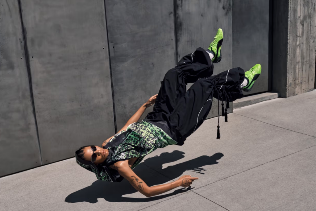 Côté vêtements, on retrouve un ensemble de survêtement oversize, un maillot de gardien revisité et des min-sacs. Photographiée par Yiskid et stylisée par Soki Mak, la campagne capture mouvement et liberté — les valeurs chères à Rihanna.