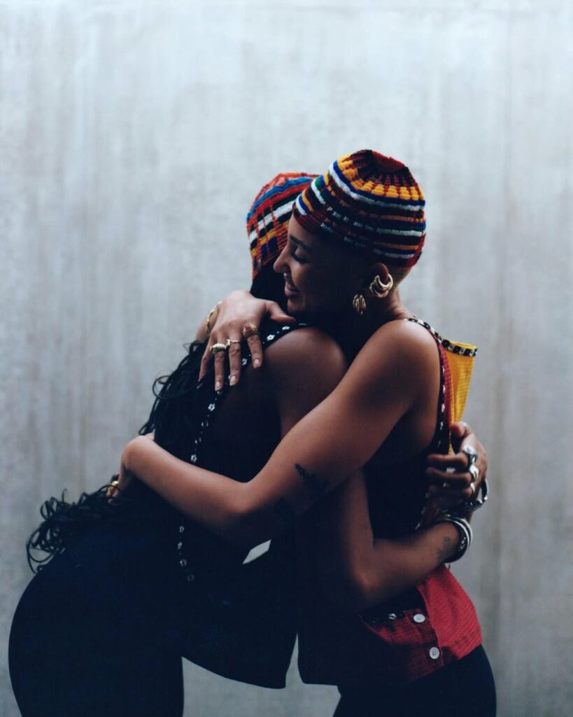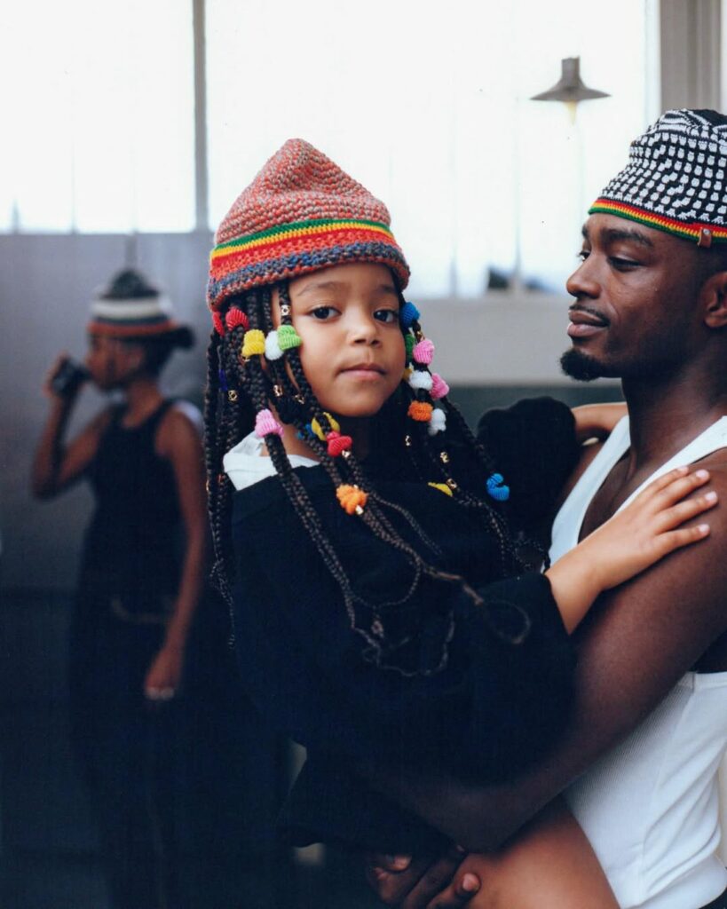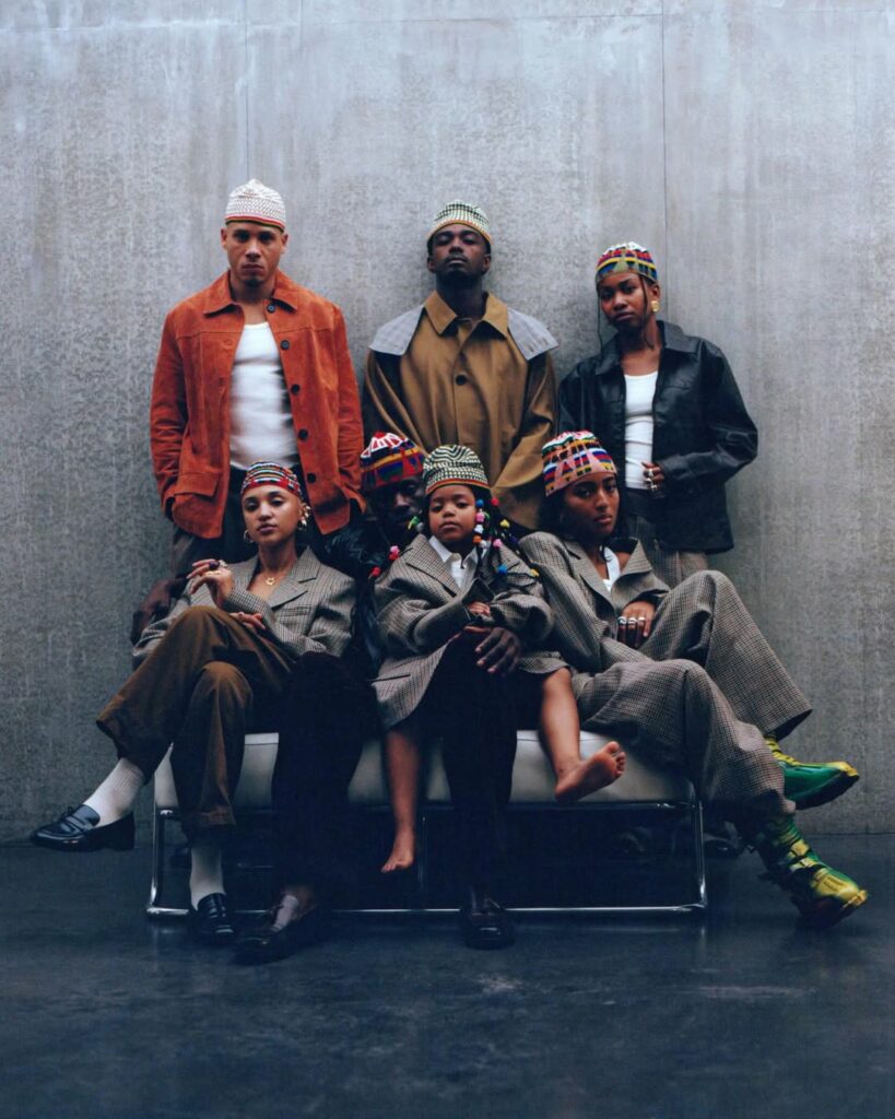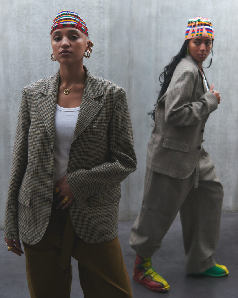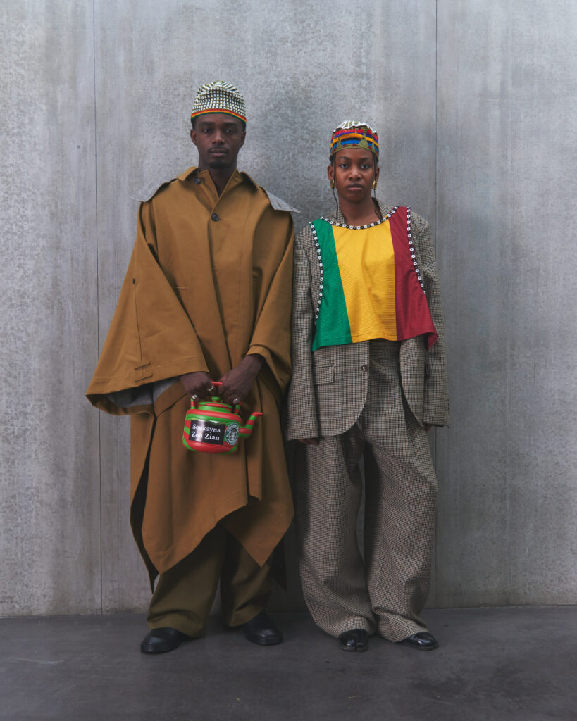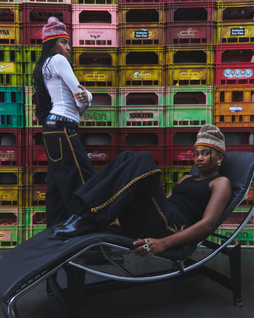 Cette collaboration est née lorsque Basile nous a contactés via Instagram pour travailler avec nous. De notre côté, nous connaissions déjà son travail, et on aimait déjà beaucoup ce qu’il faisait. La connexion s’est faite naturellement. Le projet visuel avait pour objectif de mettre en avant nos textiles et nos bonnets à travers un shooting sur fond gris, neutre, afin de laisser la matière s’exprimer. Nous voulions également intégrer des éléments symboliques : la bassine sur la tête, en référence aux marchés africains ; les caisses, qui rappellent l’ambiance du maquis, et surtout représenter la famille Soukayna Zon Zian à travers des photos de groupe, comme celle sur le canapé, qui évoque des scènes de vie et l’esprit de communauté propre à l’Afrique.