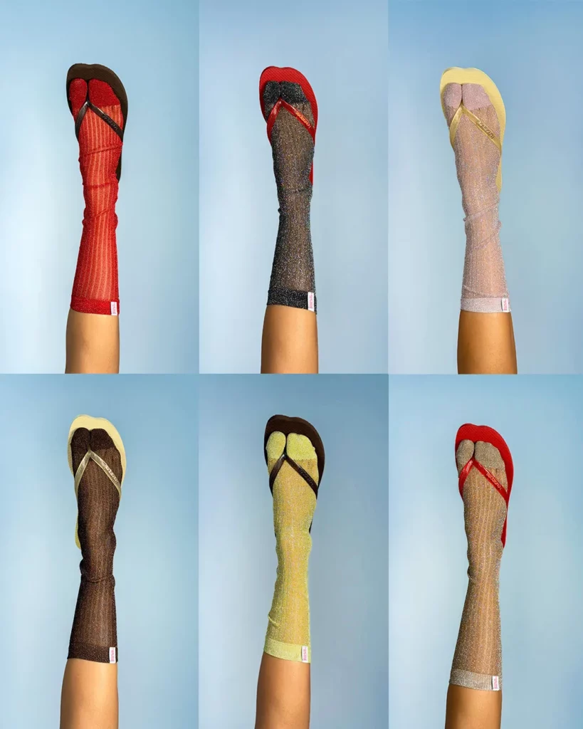 Pouce séparé du reste du pied et longueur mi-mollet, le bas se déclinent en deux versions : une plus classique, en coton, disponible en noir et blanc, et la seconde, plus fun, transparente à paillettes, que l’on retrouve en six nuances : noir, lila, rouge, brun, olive et bordeaux. À porter, bien évidemment, avec sa paire de flip-flops préférée.