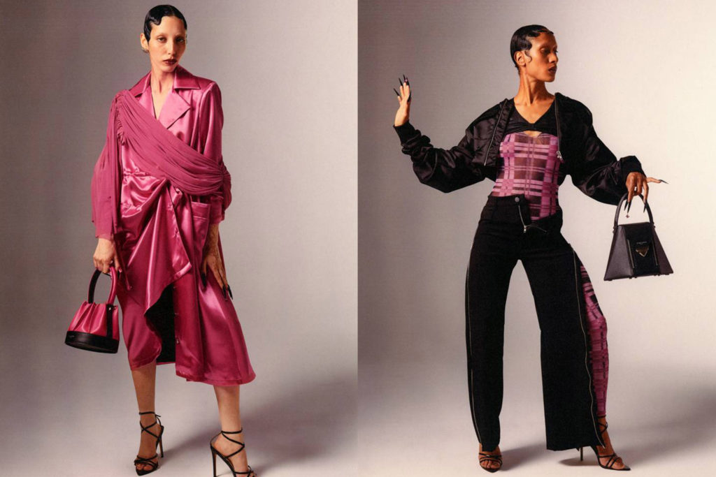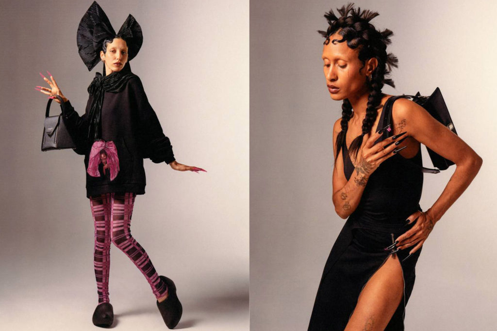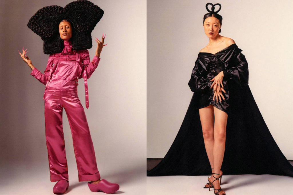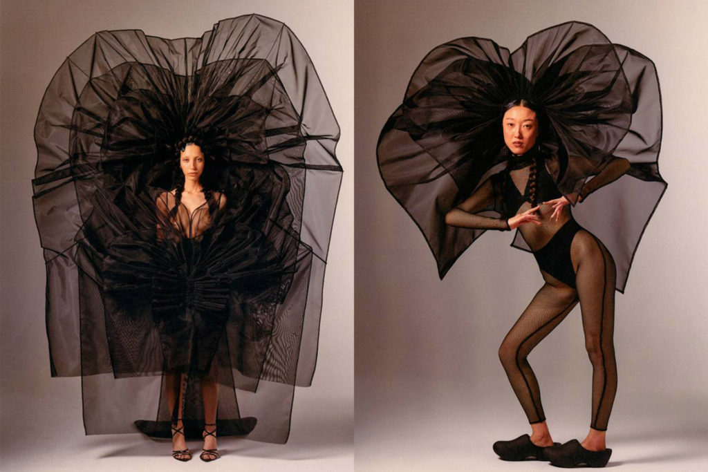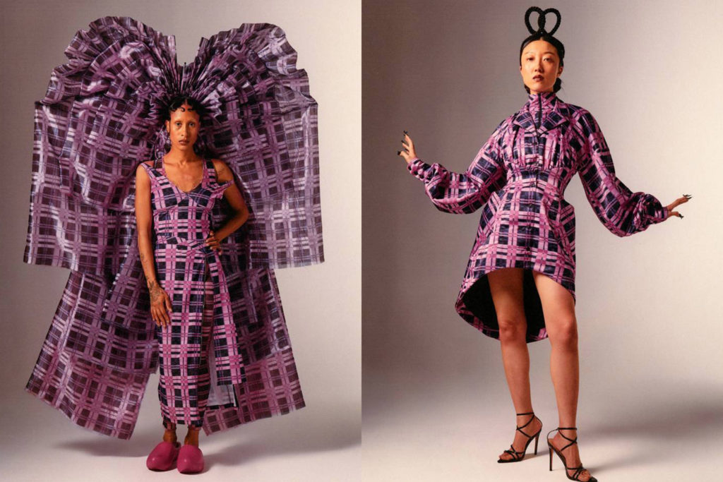 Dans l’optique de rendre hommage à ses racines alsaciennes, Weinsanto a dévoilé une série de robes façonnées en kelsch, tissu de lin, coton ou métis produit exclusivement en Alsace, décliné pour l’occasion en rose et violet. On y retrouve également des corsets revisités et drapés de satin, des combinaisons entaillées et transparentes ou encore des looks XXL couronnées de rubans des coiffes typiques alsaciennes ou de bretzels réinterprétés. Côtés accessoires, le créateur a choisi de faire un clin d’oeil au kougelhopf, dessert typique d’Alsace, pour ses sacs surdimensionnés. « Je voulais représenter une collection très personnelle qui parlerait de mon histoire, où s’entremêlent les sentiments et les souvenirs de ma famille. », a commenté Victor Weinsanto à la suite du défilé. Découvrez les looks de sa collection dans la galerie ci-dessus.